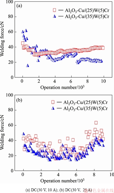 在DC(30 V,10 A)和DC(30 V,25 A)试验电流下,选取Al2O3-Cu/(25)W(5)Cr和Al2O3-Cu/(35)W(5)Cr电触头每100次操作的熔焊力的平均值建立熔焊力和操作次数的函数关系如图6所示。