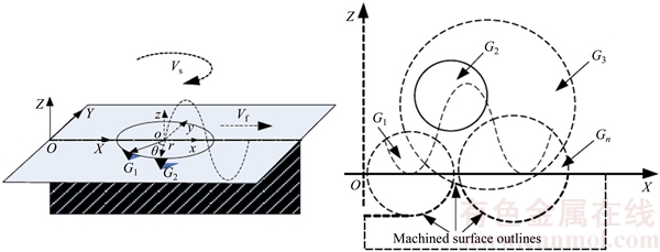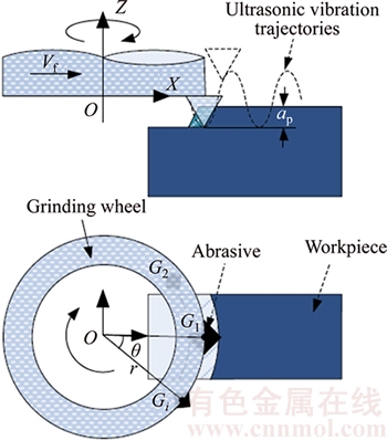 where ri (mm) is the distance between abrasive Gi and center of grinding wheel, n (r/min) is rotation speed, v (mm/min) is feed rate, t (s) is grinding time, A (μm) is ultrasonic vibration amplitude, f (Hz) is ultrasonic vibration frequency and hi is height of abrasive Gi.