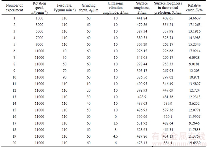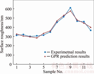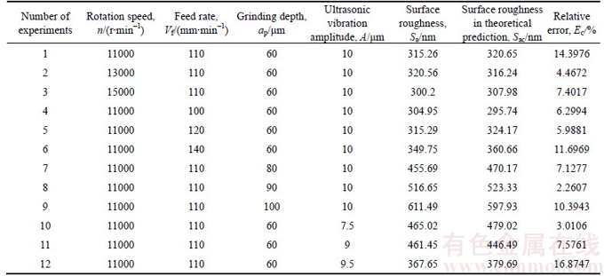 In order to verify the validity of the proposed GPR surface roughness prediction model, another 12 sets of ultrasonic vibration assisted grinding experiments of BK7 optical glass were carried out. The experimental condition was the same with the validation experiments in section 3.1. The grinding parameters and ultrasonic vibration parameters used in experiments are listed in Table 2. And the GPR prediction results are also listed in Table 2.