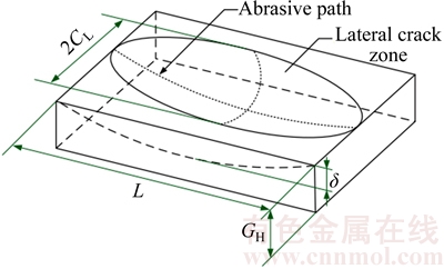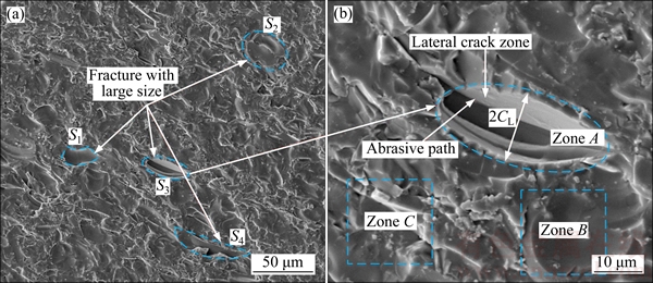 Several researchers have focused on the fracture forming mechanism in machining process of brittle materials [21], in this research, the fracture induced by one abrasive grain can be simplified as a half ellipse with three half-axis lengths of CL, CH and L/2, as shown in Figure 8, where CL is the lateral crack length, mm; CH is the lateral crack depth, mm; L is the effective cutting distance that an abrasive grain travels during effective cutting time Δt. In Figure 7(a), the zones marked as S1 and S4 are half well-developed half ellipse while zones S2 and S3 are well-developed half ellipses. Among them, zone S2 is induced by an abrasive grain whose protrusion height is relatively small while zone S3 is induced by an abrasive grain whose protrusion height is relatively big.