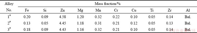 采用不同熔铸工艺进行半连续铸造得到三种实验用7020铝合金铸锭,合金成分如表1所列。铸锭经(470 ℃, 28 h)均匀化后进行挤压并在线淬火,挤压型材时效处理制度为(90 ℃, 12 h)+(170 ℃, 11 h)。