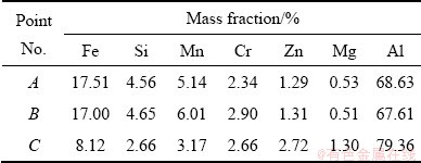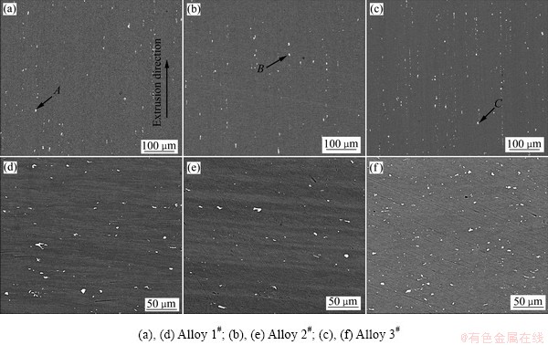 合金型材沿挤压方向纵截面金相组织如图1所示。从图1中可观察到不同合金型材纵截面上大部分为长条状挤压纤维组织,纤维组织中间分布着一些等轴状细小晶粒,1号合金晶粒尺寸比其他合金稍大。型材纵截面和与挤压法线垂直的平面SEM观察如图2所示。从纵截面中可以看到,三种合金沿挤压方向,呈条状分布着微米级的第二相颗粒。1、2号合金的第二相颗粒数量比3号合金少,且1号合金第二相倾向于集中在局部区域。不同合金中,第二相EDS能谱元素质量分数分析结果如表2中所列,从表2中可知第二相是含有Fe、Si、Mn等元素的αAl(Fe, Mn, Si)相,Fe元素在第二相中含量较高。合金熔铸时生成的αAl(Fe, Mn, Si)相熔点高,经挤压后破碎,大部分沿晶界分布,铸锭均匀化挤压时效均不能将其消除,因此也称为难溶结晶相。不同合金型材中难溶结晶相成分相似。