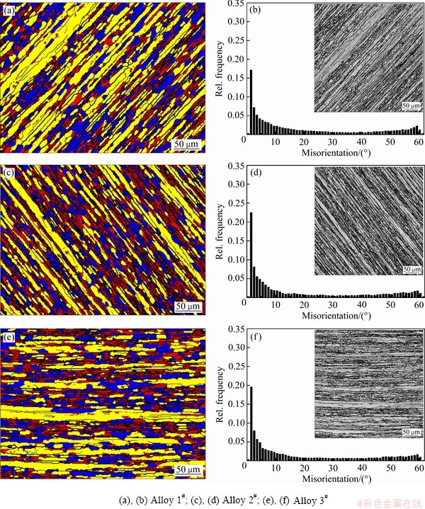 3种合金型材EBSD再结晶和晶界特征分析结果如图4所示。图中蓝色代表型材再结晶组织,未再结晶组织中黄色代表亚结构、红色代表变形组织。1、2和3号合金再结晶程度分别为33.0%、22.3%、29.5%。一般认为取向差小于15°两晶粒间晶界为小角度晶界,大于15°为大角度晶界。1、2和3号合金大于15°的大角度晶界分别41.7%、33.2%、40.2%。3号合金中难溶结晶相数量较多诱发型材再结晶程度较高。虽然1号型材难溶结晶相数量相对较少,但大于4 μm的大尺寸相绝对数量较多,如图3所示,再结晶程度最高,表明大尺寸难溶结晶相更易诱发再结晶。