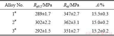 表3中所列为不同合金挤压型材经(90 ℃, 12 h)+(170 ℃, 11 h)时效工艺处理后室温拉伸性能。1号合金的强度最低,2号强度最高,相比1号合金,2号合金的屈服强度提高4.3%。1号合金伸长率最高,2号合金伸长率比1号合金低0.5%。3号合金强度和伸长率均处于中间位置。三种型材室温拉伸性能差异不显著。