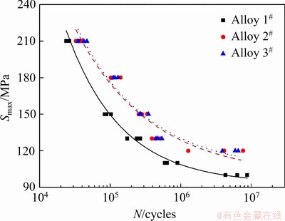 图5所示为不同合金挤压型材疲劳S-N曲线,S为加载应力,N为疲劳循环次数。疲劳循环数据拟合时采用式(1)[26]进行: