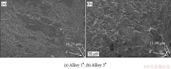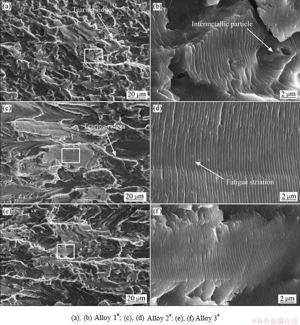 Fig. 7 SEM images of fatigue fracture surfaces for different alloys at △K of about 15 MPa·m1/2