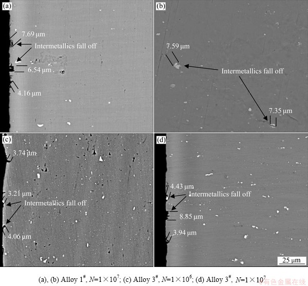 高周疲劳中疲劳总寿命包括裂纹萌生、微裂纹扩展和长裂纹生长三部分,应力循环过程中位错在难溶结晶相处积塞引起应力集中,可造成难溶结晶相开裂或界面脱粘,形成疲劳裂纹萌生源,严重影响合金疲劳性能[21]。图8所示为合金1与合金3经疲劳循环后试样疲劳区SEM观察。图8(a)、(c)、(d)中材料边界上粗大难溶结晶相在疲劳循环过程中从试样表面脱落,形成凹陷,促使应力集中,在继续施加应力疲劳循环后,可能转变为疲劳裂纹形核中心。另外,由于粗大难溶结晶相一般较为硬、脆[22],在塑性变形时常与基体变形不协调而自身开裂或在与基体界面处产生脱离而形成裂纹源,严重影响合金疲劳性能,如图8(b)所示。