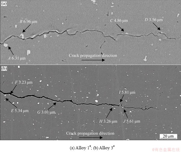 2) 疲劳裂纹尖端应力强度因子△K=10 MPa·m1/2时,有较多直径在4 μm以上难溶结晶相合金的裂纹扩展速率比含较多细小难溶结晶相合金的裂纹扩展速率快21.0%。