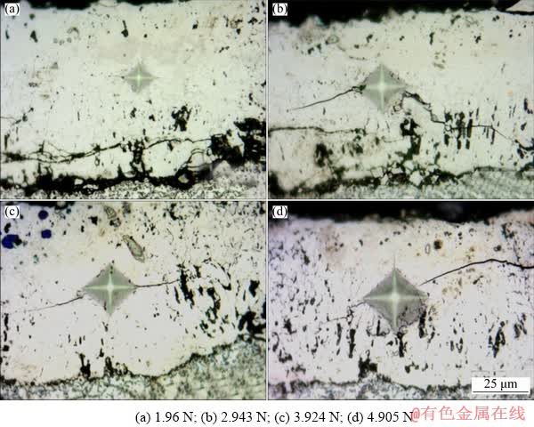 Fig. 1 OM images of Vickers indentation marks with cracks produced on gas-borided Inconel 600 alloy at different indentation loads