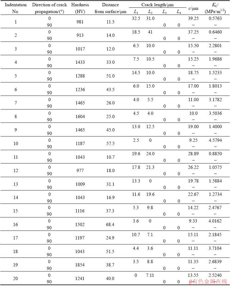 Generally, the lowest facture toughness was obtained near the top surface. For Indentation 1 (Fig. 11(a)), which was generated at the distance of 11.5 μm from the surface, the KC was equal to 0.5763 MPa·m1/2. The long cracks (32.5 and 31 μm) were generated from the corners in direction parallel to the top surface. Whereas, the short cracks were obtained for higher depth from the top surface. For Indentation 10 (Fig. 11(h)), which was generated at the distance of 57.5 μm from the surface, the KC was equal to 4.5794 MPa·m1/2. Obviously, the low length of crack (L1=2.5 μm) affected the improvement of fracture toughness.