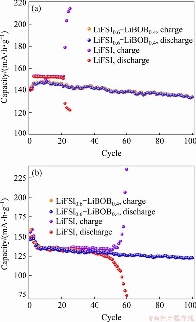 Fig. 1 Cycling performance of Li/LiFePO4 half-cells with 0.5C charge–discharge rates using electrolytes based on LiFSI0.6-LiBOB0.4 and LiFSI at 45 °C (a) and at room temperature (b)