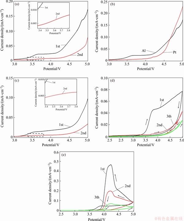 [33] MARKOVSKY B, AMALRAJ F, GOTTLIEB H E, GOFER Y, MARTHA S K, AURBACH D. On the electrochemical behavior of aluminum electrodes in nonaqueous electrolyte solutions of lithium salts [J]. Journal of the Electrochemical Society A, 2010, 157(4): 423-429.
