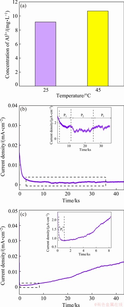 Fig. 4 Concentrations of Al3+ ions dissolved from surface film of Al foils stored in 2 mL mixed solvent of EC/DEC/EMC (1:1:1) for one week at 25 °C and 45 °C, respectively (a) and chronoamperometry curves with constant potential of 4.2 V for 12 h in LiFSI0.6- LiBOB0.4-based (b) and LiFSI-based (c) electrochemical cells employing Al as working electrodes at 45 °C