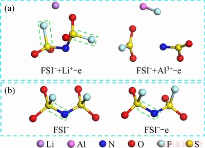 The process of AlF3 formation can be well-proven by the results of quantum chemistry calculation. As shown in Fig. 7(a), the N—S bond and S—F bond in the FSI- anion are both broken, and a new Al—F bond appears after providing an oxidizing environment (losing an electron) for the FSI- anion in the presence of the Al3+ cation; this differs from the case of substituting Al3+ with the Li+ cation. In the latter case, the S—F bond close to the Li+ cation is longer than that of the other, and its bond order is only 0.51. It is thought that the S—F bond is broken and the oxidation of FSI- anion shows difficulties. That is to say, between the two competing reactions of AlF3 generation and LiF generation, the former has more competitive advantages. This is in good agreement with the results of the XPS analysis. It is noteworthy that the oxidative decomposition of the FSI- cation becomes difficult without adding the Li+ or Al3+ cation. As shown in Fig. 7(b), after giving FSI- anion an oxidative environment, the FSI- anion bond length changes little, the N—S bond length increases slightly, and the S—F bond has nearly no change.