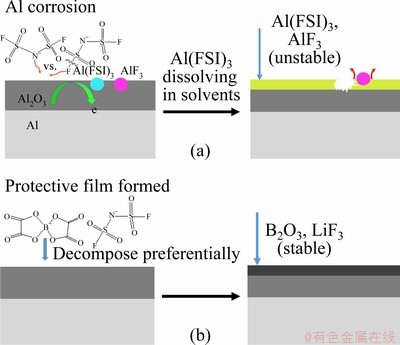 Fig. 8 Proposed corrosion mechanism of Al caused by LiFSI salt (a) and mechanism of LiBOB suppressing Al corrosion caused by LiFSI salt at elevated temperature by reinforcing interphase (b)