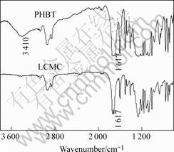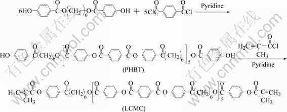 The IR spectra of PHBT and LCMC are shown in Fig.2. For PHBT, the peak at 3 409 cm-1 is assigned to terminal O—H stretching of phenol groups, and the absorption at 1 716 cm-1 results from ester groups adjacent to benzene rings. The results agree with the results reported by TAN et al [14]. For LCMC, it can be seen clearly that the peak at 3 409 cm-1 disappears compared with PHBT, showing that the O—H has fully reacted with methacryloyl chloride.