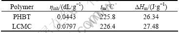 As both PHBT and LCMC are insoluble in the usual organic solvent, their intrinsic viscosities, ηinh, have to be measured in 1,1,2,2-tetrachloroethane. From Table 1, it is seen that the ηinh of LCMC is 0.079 7 dL/g, significantly higher than the value of PHBT(0.044 3 dL/g). Clearly, it can be attributed to the relative molecular mass increase as a result of the reaction between PHBT and methacryloyl chloride.