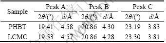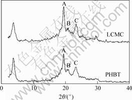 The WAXD measurement plots are shown in Fig.4 and some parameters are summarized in Table 2. It can be seen that both PHBT and LCMC have one group of low intensity diffraction peaks located at the range of 19-25°of 2θ angle. These indicate that there are some crystal parts in these two kinds of polymers except the amorphous parts. We can also see that the position of diffraction peaks and interplanar spacing (d) values of two polymers are similar, illustrating that the two polymers attribute to one crystal systems. The d values of LCMC are smaller than these values of PHBT due to the crystal degree increase little because of the introduction of methacryloyl group. These results agree well with the results analyzed by POM.