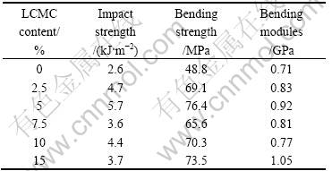 The impact behavior of the specimens with dimension of 120 mm×10 mm×4 mm was determined using Izod impact machine(model JC-25) at room temperature; the bending strength was tested by Shimadzu universal testing machine (mode AG-201) with test rate of 2 mm/min.