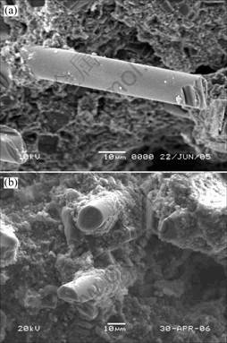Fig.5 shows the SEM micrographs of the impact fracture surfaces of compression-molding specimens of composites. The fracture surfaces show remarkable difference between the composites with LCMC and that without LCMC. It is obvious that, the surface of glass fiber in composites is clear and free of any links to the unsaturated polyester matrix (Fig.5(a)). In contrast, in the composites containing 5% LCMC (Fig.5 (b)), there is much unsaturated polyester matrix linked to the fiber surface. It can be also found that the length of drawn glass fiber from matrix of composites without LCMC is longer than that containing 5% LCMC. These result from