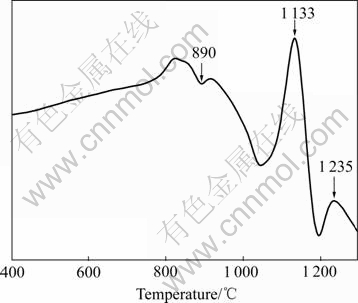 图1所示为基础玻璃粉末样品以5 ℃/min的速度加热所得样品的DSC曲线。从图1可知:样品有一个吸热峰,两个放热峰,吸热峰的峰值温度为890 ℃,两个放热峰的峰值温度分别为1 133和1 235 ℃。根据DSC曲线可初步确定基础玻璃样品的析晶温度范围为1 050~1 300 ℃。