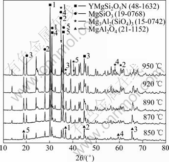 图2所示为样品在不同温度下核化8 h再在1 130 ℃下保温2 h所得样品的XRD谱。所制备的微晶玻璃的XRD谱非常复杂,衍射峰非常多,为便于说明,对于每种物相,XRD谱中只标出了5个最强衍射峰,且分别根据这些物相的标准卡片对这5个衍射峰的衍射强度按1、2、3、4和5进行排序。XRD分析结果表明:成核温度的变化对所制备的氧氮微晶玻璃中析出的物相的种类影响较小,不同热处理制度下制备的微晶玻璃样品中都包含YMgSi2O5N、MgSiO3和少量的Mg3Al2(SiO4)3相。在较低的成核温度下,有少量 MgAl2O4相析出;随着成核温度的升高,MgAl2O4相含量逐渐减少,当成核温度升至920 ℃时,XRD检测限内未检测到MgAl2O4相的存在。从图2可明显地看到:成核温度从890 ℃升高到920 ℃时,2θ=37?的衍射峰的强度急剧减弱,且随着核化温度进一步升高而进一步减弱。前者主要由MgAl2O4相的消失引起,后者是因所制得的微晶玻璃中Mg3Al2(SiO4)3相的含量随着核化温度的升高而逐渐减少所引起。在这几种热处理制度下,主晶相均为YMgSi2O5N。除YMgSi2O5N外,在所制备的微晶玻璃中未检测到其它含氮的晶相。YMgSi2O5N的组成非常接近Y-Al-Si-O-N氧氮微晶玻璃中析出的B相(Y2SiAlO5N),而在所有氧氮微晶玻璃系统中还未见任何有关YMgSi2O5N析出相的报道。