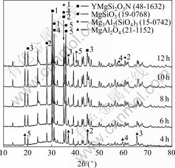 在确定好最佳核化温度之后,为确定最佳核化时间,制定了5个不同的热处理制度:920 ℃, 4 h+1 130 ℃, 1 h;920 ℃, 6 h+1 130 ℃, 1 h;920 ℃, 8 h+1 130 ℃, 1 h;920 ℃, 10 h+1 130 ℃, 1 h;920 ℃, 12 h+1 130 ℃, 1 h。图4所示为经过这5个不同热处理制度所制备微晶玻璃样品的XRD谱。分析结果表明:核化时间对所制备微晶玻璃的析出物相的种类影响较小,所有样品都析出YMgSi2O5N、MgSiO3和少量的Mg3Al2(SiO4)3相,其中YMgSi2O5N为主晶相。核化时间为4 h时有少量MgAl2O4 析出,随着时间的延长MgAl2O4相含量逐渐减少,当时间增至8 h时MgAl2O4相消失。所制备氧氮微晶的析晶度随核化时间的变化趋势如图5所示。从图5可知,微晶玻璃的析晶度受基础玻璃核化时间的影响很大,随着核化时间的延长,析晶度逐渐增大,当核化时间为10 h时,析晶度达到最大值,之后析晶度随核化时间的延长而减小。这可能是因为950 ℃比较接近基础玻璃的晶化温度,所以在此温度核化时,有些已经形成的晶核又重新熔解。因此,对于组成为Mg8.88Y5.92Al10.15Si15.22O52.65N7.19的基础玻璃,其最佳核化时间应为10 h。