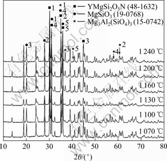 在确定了样品的最佳核化温度(920 ℃)和核化时间(10 h)之后,将基础玻璃在920 ℃保温10 h核化,再分别在1 070、1 100、1 130、1 160、1 200和1 240 ℃下保温1 h晶化。图6所示为根据以上热处理制度制备的微晶玻璃样品的XRD谱。从图6可知,不同晶化温度下制备的微晶玻璃的析晶度都很高,因此样品晶化1 h已足够,没有必要再延长晶化时间。XRD分析表明:晶化温度对所制备的氧氮微晶玻璃中的析出物相的种类影响较小,所有样品同样都含有YMgSi2O5N、MgSiO3和少量的Mg3Al2(SiO4)3相,其中YMgSi2O5N为主晶相;随着晶化温度的升高,2θ=37?衍射峰的强度逐渐增强,而此衍射峰对应于Mg3Al2(SiO4)3相的特征衍射峰。因此,随着晶化温度的升高,Mg3Al2(SiO4)3相的含量逐渐增加。