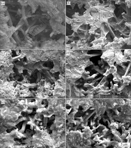 Fig.7 SEM section micrographs of glass samples nucleated at 920 ℃ for 10 h and subsequently heated at different temperatures for 1 h: (a) 1 070 ℃; (b) 1 100 ℃; (c) 1 130 ℃; (d) 1 160 ℃; (e) 1 200 ℃; (f)1 240 ℃