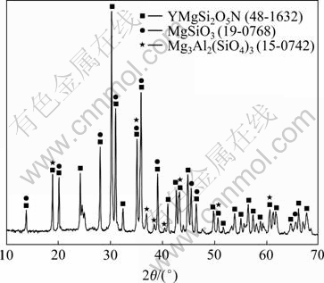 除两步热处理外,本研究中还采用一步热处理法来制备Mg-Y-Al-Si-O-N微晶玻璃。氧氮玻璃由于氮的引入玻璃网络结构得到强化,其微晶玻璃的制备通常需要在较高温度下长时保温。本研究中将基础玻璃在1 150 ℃保温10 h制备氧氮微晶玻璃,其XRD谱如图9所示。从图9可知:经过上述一步热处理制度后,所制得的氧氮微晶玻璃的析晶程度较高。XRD分析结果表明:此热处理制度下所制备的微晶玻璃主要由YMgSi2O5N相组成, 还包括一部分MgSiO3和少量的 Mg3Al2(SiO4)3相。而文献[21]中曾用同样的一步热处理制度对Mg6.27Y4.86Al11.83Si16.22O54.9N5.91玻璃进行热处理,得到的微晶玻璃包含大量的残余玻璃相和少量的MgAl2O4相。造成这一差别可能有两个原因:1) 热处理过程中的气氛不同,文献[21]中采用的是N2气氛,本研究中采用局部CO还原性气氛;2) 玻璃的组成不同。将Mg8.88Y5.92Al10.15Si15.22O52.65N7.19玻璃样品进行一步热处理或两步热处理,所制备微晶玻璃中包含的物相种类基本相同,说明热处理制度对此玻璃析出相的种类影响较小。