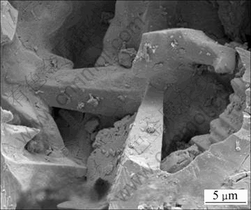 图10所示为氧氮基础玻璃在1 150 ℃保温10 h所制备的微晶玻璃的横截面SEM像。从图10可知,微晶玻璃中析出了大量直径为5~6 μm、长度大于10 μm的棒状YMgSi2O5N 晶粒,这些晶粒的尺寸远大于采用本研究中所制定的任何两步热处理制度而得的微晶玻璃中的棒状晶粒的尺寸。因此,与一步热处理制度相比,两步热处理制度能更好地控制晶粒尺寸。对一步热处理后的微晶玻璃样品进行强度测试,其三点抗弯强度值为178 MPa,远低于图8所示的任何通过两步热处理制度制备的微晶玻璃的强度。这可能是因为一步热处理制备的氧氮微晶玻璃的晶粒较粗大。