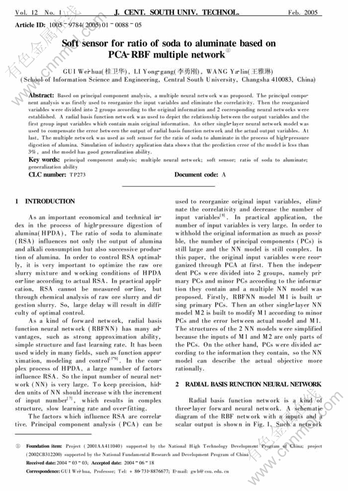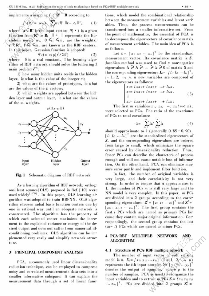 Soft sensor for ratio of soda to aluminate based on PCA-RBF multiple network①