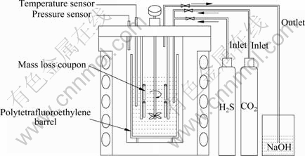 本研究采用镍基合金G3的成分如表1所列。试样用SiC水砂纸逐级打磨至1000#,用蒸馏水清洗,丙酮除油。利用25 MPa哈氏合金动态高温高压反应釜开展H2S/CO2腐蚀试验,试验介质为模拟普光溶液,其离子组成如表2所列,试验温度为130 ℃,H2S分压为10 MPa,CO2分压为6 MPa,元素S含量分别为0、1、10、100 g/L,试验时间720 h。为了防止高压釜遭受严重的腐蚀,在高压釜内胆中加聚四弗乙烯衬套,试验装置示意图如图1所示。试验前室温下先通入高纯氮除氧2 h,然后先通入H2S气体达到饱和,升温至目标温度确保H2S分压为10 MPa,再降温至室温,通入CO2气体,再升温至目标温度,使得CO2分压为6 MPa,即总压为16 MPa。整个过程需要经过仔细计算,确保在目标温度下H2S、CO2气体分压准确。