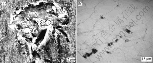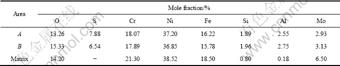 图4(a)所示为镍基合金G3在100 g/L元素S条件下腐蚀后的点蚀坑微观形貌图。从图4(a)中可以看出,点蚀坑的形状为不规则的圆形,尺寸大小约为15 μm左右,点蚀坑周围试样表面比较光滑,覆盖有一层薄薄的晶粒很细小的腐蚀产物,在点蚀坑内部腐蚀产物相对较多且晶粒相对粗大,利用EDS能谱分析得知,点蚀坑内腐蚀产物主要为Cr、Ni、Fe的氧化物及硫化物组成,其各元素的摩尔分数如表3所列。将试样表面抛光并利用浓盐酸+10%(质量分数)Fe3Cl 侵蚀以后,可以明显看出点蚀坑萌生于晶界附近,点蚀的发生明显以沿晶为主,穿晶为辅,如图4(b)所示。一般情况下,晶界是原子排列较为疏松而紊乱的区域,此区域容易富集杂质原子,产生所谓的晶界吸附和晶界沉淀,此化学不均匀性会导致晶界比晶粒化学活性高,具有更负的电极电位值,故点蚀一般从晶界开始。PAN等[21]研究发现含0.01%C(摩尔分数)的镍基合金的碳化物容易在晶界处呈薄片状连续析出,导致碳化物析出附近形成带状贫Cr区,由于Cr、Mo扩散速度慢,靠近晶粒边界附近的Cr、Mo含量远远低于耐腐蚀介质侵蚀所需的最低临界值[22]。耐蚀元素Cr和Mo在析出相中的富集导致晶界贫Cr、Mo,因此,Ni、Cr、Mo合金在晶界处容易腐蚀,形成局部腐蚀坑。表3的能谱结果表明,发生局部腐蚀的区域,Cr、Mo的含量偏低,而杂质Si、Al的含量偏高,这一点与前人的研究结果一致。