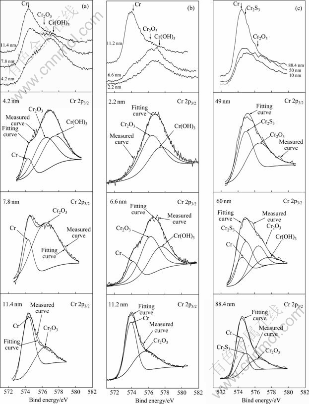 图7所示为是镍基合金G3在不同元素S含量条件下腐蚀后钝化膜中Cr元素的价态分析及拟合曲线。从钝化膜的成分分布来看,在仅有H2S/CO2气体而没有元素S的条件下腐蚀后,钝化膜表层中氧含量较高,在钝化膜内层,氧含量降低,Ni、Cr 的含量增高,钝化膜中的Ni 含量较Cr 含量高。XPS 分析结果显示,钝化膜表面主要是Ni、Cr,由氢氧化物和氧化物构成,而钝化膜内部则主要是由Ni、Cr 的氧化物构成(见图6(a))。在10 g/L元素S条件下腐蚀后,钝化膜中元素含量变化与没有元素S条件下腐蚀后的结果类似,钝化膜中氧含量仍然较高,在表层出现很少量的S,但这并不影响其钝化膜的完整性。XPS 的分析结果显示,钝化膜表层主要由Ni、Cr 的氢氧化物构成,而钝化膜内层则主要由Ni、Cr的氧化物构成(见图7(b))。在前两种条件下形成的钝化膜元素分布图中,Cr元素的含量均在表面富集,其原因可能是Ni的氢氧化物(Ni(OH)2的溶度积(5.48×10-16)高于Cr的氢氧化物Cr(OH)3(6.3×10-31)的溶度积[23],Ni的氢氧化物比Cr的氢氧化物更易溶解于水相关。镍基合金G3在100 g/L元素S条件下腐蚀后,钝化膜结构发生了明显的变化,表层主要由Ni和Cr的硫化物组成,而内层则主要是由Ni、Cr 的氧化物构成。在硫化物层,Ni 的含量高于Cr,其原因可能与NiS以及Cr2S3在水中的水解能力有关。NiS难溶于水,β-NiS的溶度积为1×10-24,而Cr2S3水解能力强,在水中容易分解[23],这可能导致钝化膜表层中Ni含量高于Cr的。
