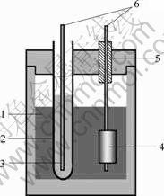 Fig.1 Schematic diagram of reactor electrolytic cell arrangements: 1—Molten electrolyte; 2—Solid oxygen-ion membrane; 3— Copper alloy liquid; 4—Nb2O5; 5—Alumina separator; 6—Molybdenum rod