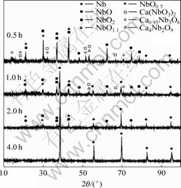 为研究SOM法用于Nb2O5电解脱氧的过程,在电解温度及电压分别为1 150 ℃和3.2 V的条件下,针对电解时间0.5、1、2和4 h的实验条件下进行了系列实验。将实验得到的阴极制粉进行XRD分析,结果如图2所示。