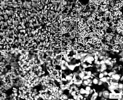 图3所示为Nb2O5原始电极和不同电解温度下横截面的SEM像。图3(a)所示为Nb2O5粉末压制成型、烧结后的形貌。由图3可看出,当电解温度为950 ℃时,相对于烧结后的阴极,颗粒尺寸有所变小,颗粒较致密,空隙多而密,背散射照片上除了白色相外,还有一些颜色较暗的区域(见图3(b));当电解温度为 1 050 ℃时,试样多为球形颗粒,颗粒较电解前有所长大,结构更为致密,颗粒间接触面较大,出现了较大的空隙,分析认为是氧化物转变为金属颗粒体积收缩所致(见图3(c));当电解温度为1 150 ℃时,铌颗粒聚集长大更为明显,小颗粒有熔化进入大颗粒的趋势,由于大颗粒在熔盐内较长时间的烧结已开始显现出多边形形貌,大颗粒间出现了更多大的空隙(见图3(d))。