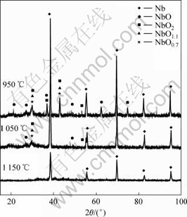 图4所示为不同电解温度下产物的XRD谱。由图4可见,经950 ℃电解4 h后,产物中既有NbO的衍射峰,还有少量NbO2、NbO1.1和NbO0.7的衍射峰,这说明电解反应不彻底,与能谱分析结果相符合;经1 050 ℃电解后,产物中除了金属Nb的衍射峰之外,还有少量NbO的衍射峰;经1 150 ℃电解后,产物中只有金属Nb的衍射峰,未见其它杂质峰。从XRD研究谱中可发现,电解反应后期,阴极内没有发现铌钙化合物的衍射峰,结合前面的分析,本研究认为SOM法能很好地控制铌钙化合物生成,减少电解过程副反应的发生。低温时反应不彻底,这是由于在较低温度时会形成颗粒细小、结构致密的金属产物,O2?在晶粒内的扩散系数较小,加之熔盐在低温的粘度较大,其渗入阴极内部较困难。同时低温下,透氧膜的氧离子传导率也受到一定的制约,以上诸多因素将导致阴极内部氧化物的脱氧过程减缓。因此,低温脱氧反应需较长时间,阴极才能被完全还原。当温度为1 150 ℃时,电解反应可在4 h内完成,且实验效果较为理想,故电解温度对还原反应的进行有较大的影响。