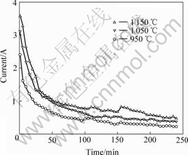 图5所示为电解电压为3.2 V,电解温度分别为950、1 050和1 150 ℃时,电流随时间变化的曲线。图中实验数据表现出以下的变化规律:回路电流随实验温度的升高而增大;电解初始阶段电流较大,电流值衰减较快;电解大约1 h后,电流衰减减慢,整个电解过程电流的波动较小。