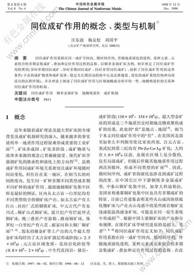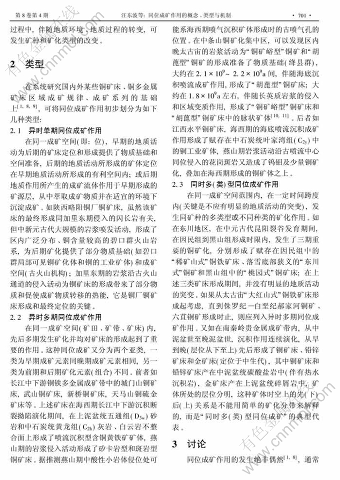 摘 要:同位成矿作用系指在同一成矿空间内,循时间序列,伴随地质演化的进程, 某种元素、 元素组合的多期富集成矿、 叠加和定位作用过程的总称。 以铜多金属矿床为例,初步厘定了同位成矿作用的类型(异时单期同位成矿、异时多期同位成矿、 同时多型同位成矿)、 剖析了同位成矿作用的边界条件(丰富的成矿物质和成矿流体、 稳定且长期活动的热中心及迁移通道、 优化的成矿系统结构和局部适宜的沉积环境),并从理论上阐述了同位成矿作用与区域地幔成分的不均一性、地幔喷流柱的关系和同位成矿作用的机制。