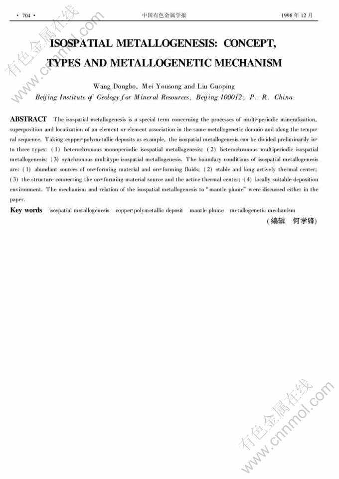 Key words:isospatial metallogenesis; copper-polymetallic deposit; mantle plume; metallogenetic mechanism