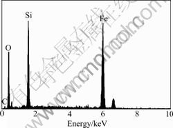 The SEM photograph of the worn surface under wet condition is shown in Fig.7. The grooves are shallow and the worn surface is smooth. Furthermore, there are frictional films attached on the worn surface, and some friction films overlap each other. Under wet condition, SiC matrix reacts with adsorbing moisture that evaporates under friction heat and produces SiO2·xH2O or H2SiO3, and Fe has chemical reaction with water and forms Fe(OH)3 as well[17-18]. Fig.8 shows the EDAX spectrum of frictional film under wet condition. There are Fe and O elements.