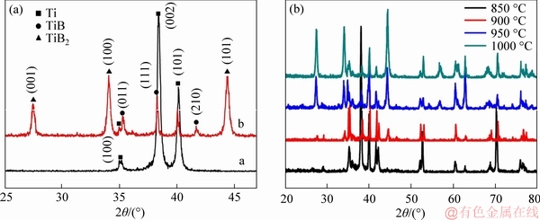 Figure 1 XRD pattern of pure Ti and TiB2-TiB/Ti sample at 950 °C (a) and samples prepared at different boriding temperatures (b)