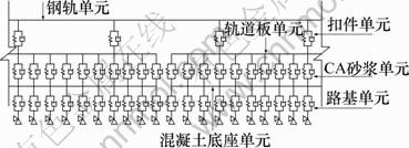 钢轨、轨道板、底座均以梁单元模拟,连接钢轨与轨道板的扣件、连接轨道板与底座板的CA砂浆以线性弹簧-阻尼单元模拟,路基模型采用文克尔假定,也以线性弹簧-阻尼单元模拟(见图2)。
