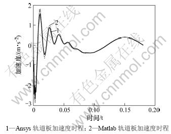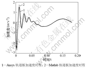 其中:v=83.3 m/s,分别用Ansys和自编Matlab程序对此工况进行计算。加载点轨道板和底座板加速度时程曲线对比见图3和图4。