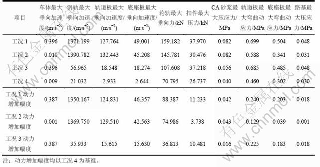 时间步长取为6×10-5 s,每一时间步长移动5 mm,以合理考虑短波随机不平顺的影响,不同随机不平顺工况下列车-板式无砟轨道-路系统竖向振动响应比较见表3。