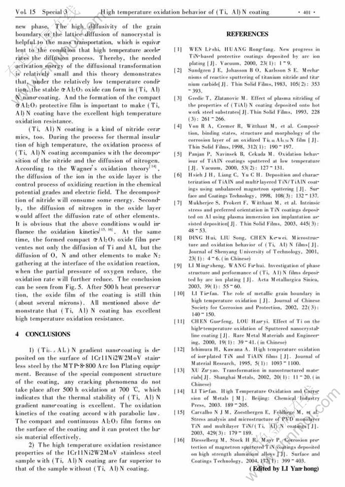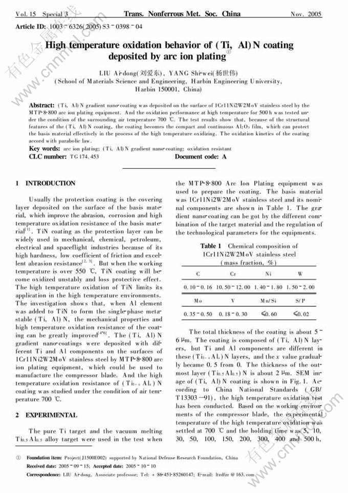 Key words:arc ion plating; (Ti, Al)N gradient nano-coating; oxidation resistant