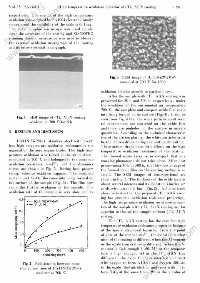 Abstract: (Ti, Al)N gradient nano-coating was deposited on the surface of 1Cr11Ni2W2MoV stainless steel by the MTP-8-800 arc ion plating equipment. And the oxidation performance at high temperature for 500h was tested under the condition of the surrounding air temperature 700℃. The test results show that, because of the structural features of the (Ti, Al)N coating, the coating becomes the compact and continuous Al2O3 film, which can protect the basis material effectively in the process of the high temperature oxidizing. The oxidation kinetics of the coating accord with parabolic law.