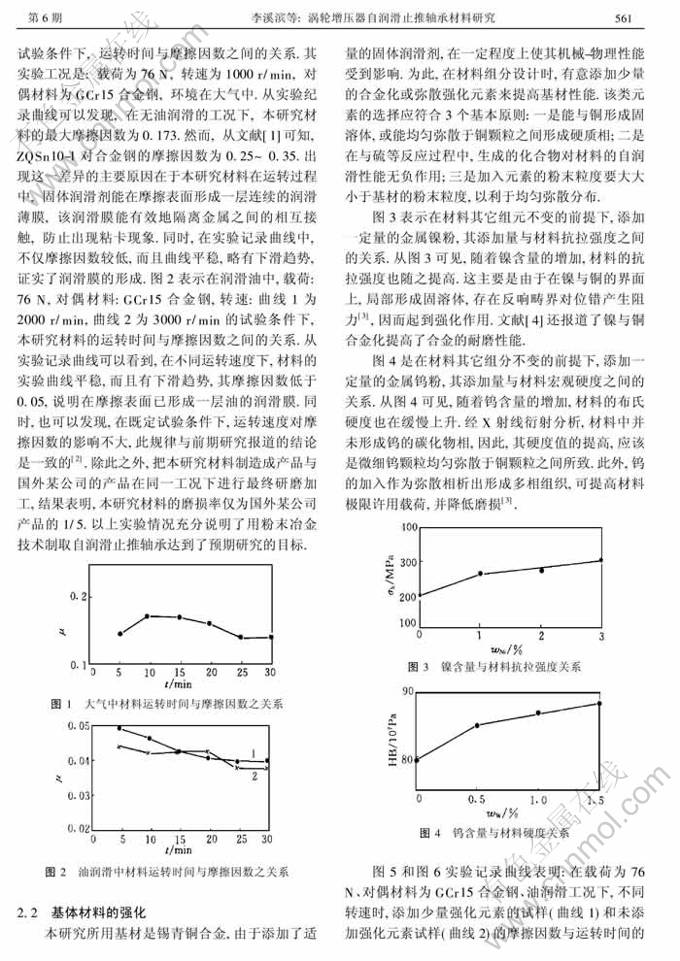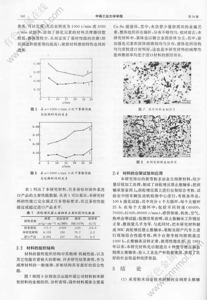 摘 要:依据涡轮增压器止推轴承的特殊工况, 首次采用粉末冶金技术来制取该类材料.在确定主要工艺参数的基础上,研究了基体材料的组成及其相互影响;检测了材料的摩擦磨损性能;分析了装机台架综合考 核数据;同时,将该产品与国际上现用同类产品进行性能比较,结果表明,该材料的拉伸强度和自润滑性能等优于国际上同类产品性能.该产品现已投入工业生产和 批量应用,取得了十分满意的经济效益.